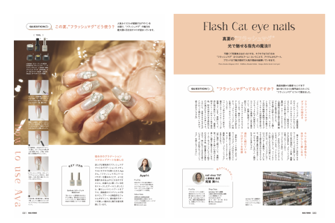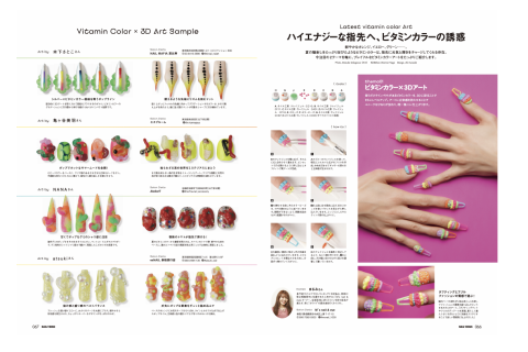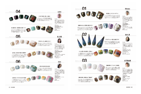 さらに、旬のフラッシュマグネット系ジェルにフォーカスした「Flash Cat eye nails/真夏の“#フラッシュマグ” 光で魅せる指先の魔法!!」、シーズンモチーフであるビタミンカラーを特集した「Latest vitamin color Art/ハイエナジーな指先へ。#ビタミンカラー の誘惑」なども収録。